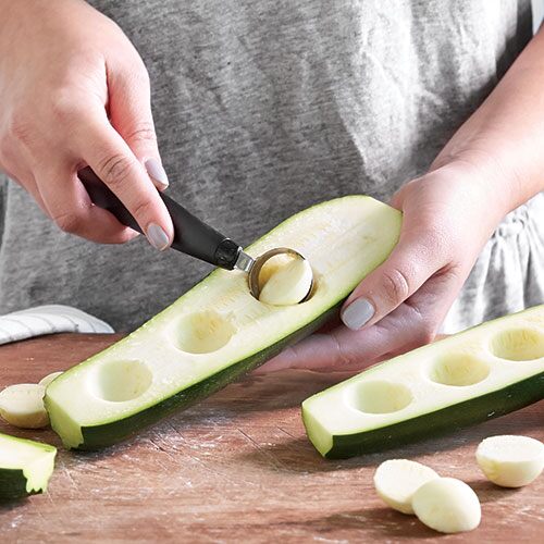 The Core & More cores, seeds, and removes stems from foods like strawberries, peppers, tomatoes, and cucumbers. You can make melon balls and create cucumber or zucchini boats with the double-sided scoop. It works well with large and small fruits or vegetables to streamline produce preparation.